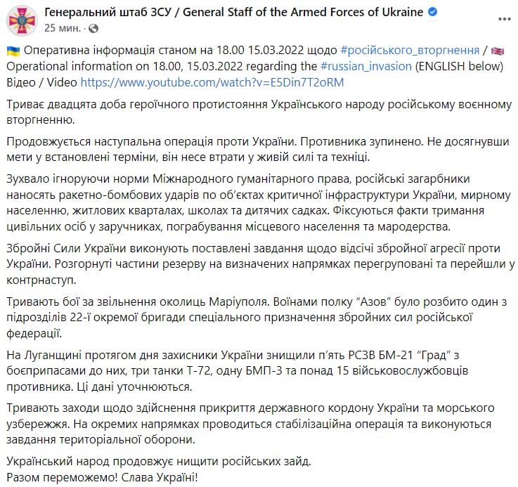 15 марта 2022 года идет двадцатый день войны. В нашем онлайне — главное об обстановке в городах Украины и на фронтах