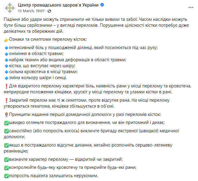 После того, как в ЦОЗ объяснили украинцам, как оказать первую помощь при растяжении связок, представители ведомства рассказали о том, что делать при переломе и как помочь себе или близким до приезда медиков.