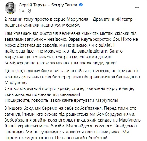 "Два часа назад прямо в сердце Мариуполя – Драматический театр – рашисты сбросили сверхмощную бомбу. Там скрывалось от обстрелов огромное количество горожан, сколько под завалами погибших неизвестно" - говорится в сообщении.