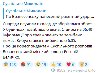 "Около 06:00 в Вознесенске Николаевской области по одному из складов нанесли авиаудар, информации о травмированных и погибших пока нет", - сообщил Величко.