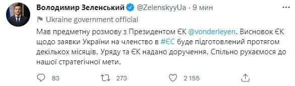 "У меня был содержательный разговор с президентом ЕК. Заключение ЕС по заявке Украины на членство в ЕС будет подготовлено в течение нескольких месяцев. Правительство Украины и ЕК проинструктированы. Двигаемся к нашей стратегической цели вместе", - написал он.