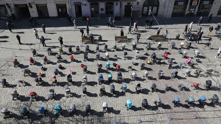 В центре Львова провели акцию, чтобы почтить память сто девяти погибших с начала войны украинских детей. На центральной площади города - площади Рынок поставили 109 пустых колясок.