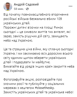 "Это та страшная цена войны, которую платит сегодня Украина. И мы призываем всех взрослых всего мира единственным щитом уберечь украинских детей и подарить им будущее. Требуйте от правительств других стран закрытия неба над Украиной", - написал Садовый.