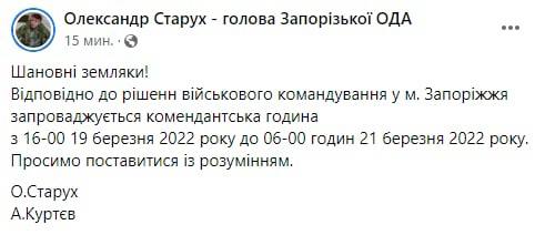 09.20 В Запорожье вводится почти двухдневный комендантский час.