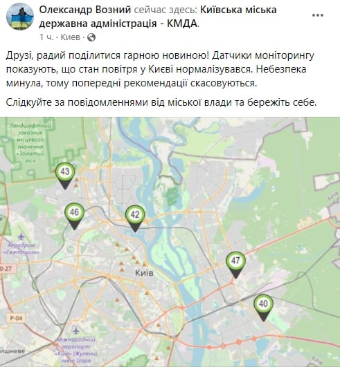 08.24 КГГА сообщает о "незначительном задымлении" в Киеве. Связывает это со сменой направления ветра.