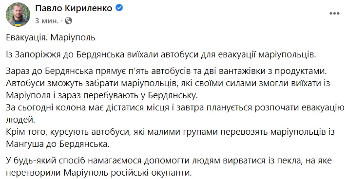 • из Мариуполя в Запорожье. Выехала колонна автобусов для перевозки людей из Бердянска в Запорожье. Также в сторону Бердянска выехали фуры с продуктами для помощи мариупольцам в Бердянске. Также оказывается помощь мариупольцам, которые оказались в городе Мангуш (они туда идут пешком) – оттуда их увезут в Бердянск.