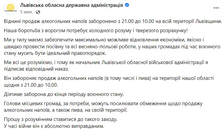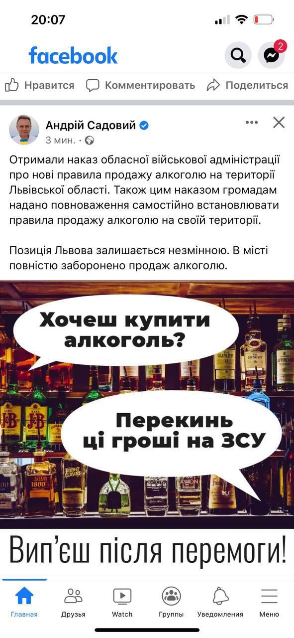 20:18 Мэр Львова Садовой заявил, что в городе продолжится полный запрет на продажу спиртного.