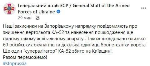 19:19 Генштаб ВСУ сообщил, что на Запорожском направлении уничтожен один российский вертолет КА-52, а второй – подбит.