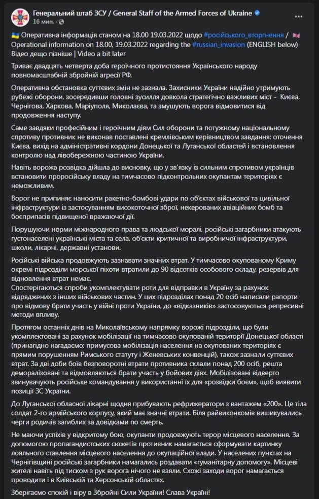 06.45 Ночью Генштаб выпустил подробную сводку боевых действий за 18 марта.