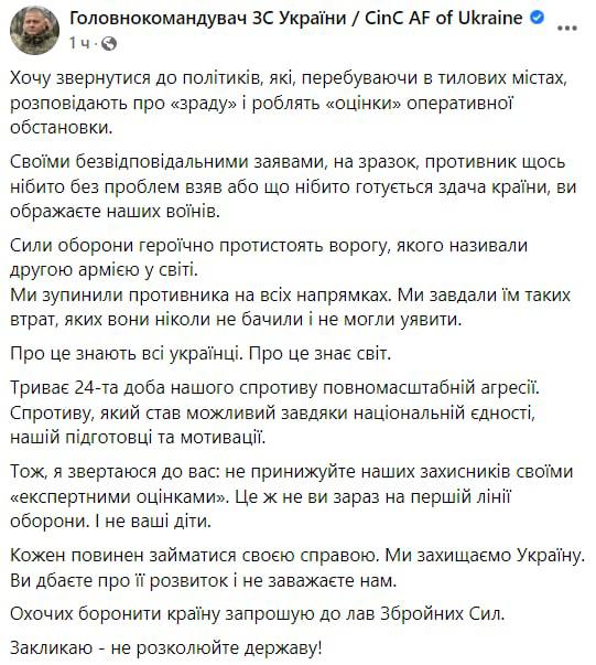 Главнокомандующий украинскими вооруженными силами Украины Валерий Залужный в Facebook раскритиковал политиков, которые разгоняют "зраду".