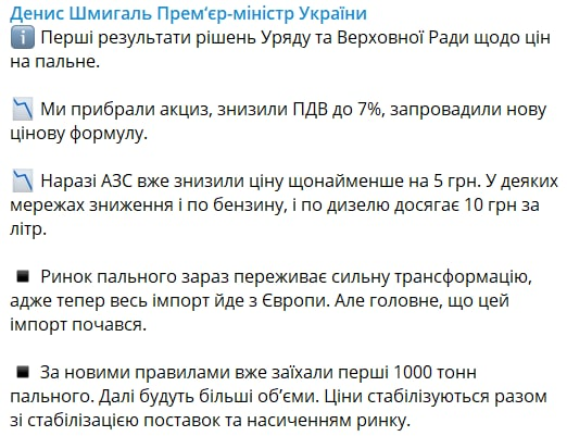 "Рынок горючего сейчас переживает сильную трансформацию, ведь теперь весь импорт идет из Европы. Но главное, что этот импорт начался. По новым правилам уже въехали первые 1000 тонн горючего. Дальше последуют большие объемы. Цены стабилизируются вместе со стабилизацией поставок и насыщением рынка. Работаем дальше ради нашей победы!" - заявил Шмыгаль.
