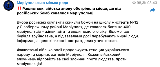 "Вчера российские оккупанты сбросили бомбы на школу искусств №12 в Левобережном районе Мариуполя, где скрывались около 400 мариупольцев – женщины, дети и пожилые люди. Известно, что здание разрушено, а под завалами все еще находятся мирные люди. Информация о количестве пострадавших уточняется", - говорится в сообщении.