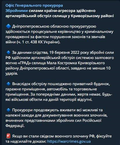 "Вооруженными силами страны-агрессора произведен артиллерийский обстрел поселка в Криворожском районе. Днепропетровской областной прокуратурой осуществляется процессуальное руководство по уголовному производству по факту нарушения законов и обычаев войны (ч. 1 ст. 438 УК Украины)", - указано в сообщении.