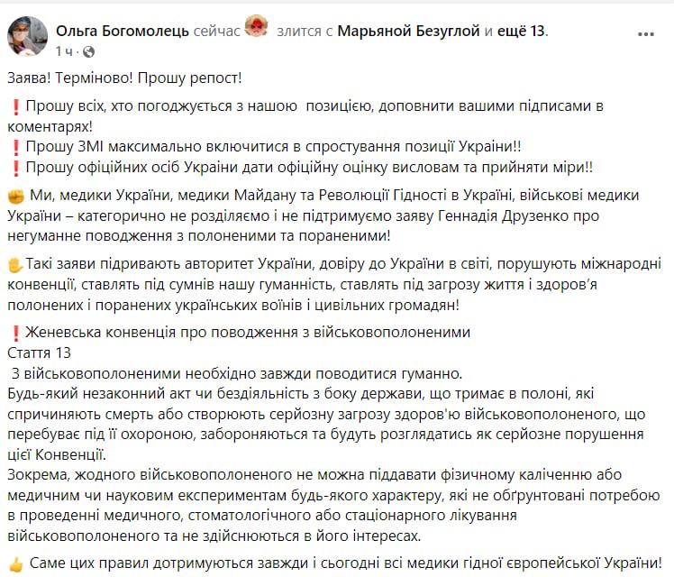 "Мы, медики Украины, медики Майдана и Революции Достоинства в Украине, военные медики Украины – категорически не разделяем и не поддерживаем заявление Геннадия Друзенко о негуманном обращении с пленными и ранеными! Такие заявления подрывают авторитет Украины", - говорится в сообщении, подписанном экс-нардепом Ольгой Богомолец и другими докторами.