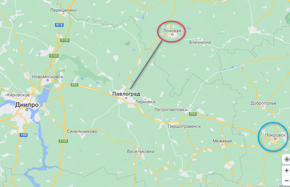 То есть целью противника может быть захват этой трассы, чтобы замкнуть "котел" для украинских войск, расположенных к западу от Донецка. Либо, как минимум, блокировать движение транспорта за счет ударов по инфраструктуре (до Павлограда и южной, и северной группе войск РФ еще далеко).