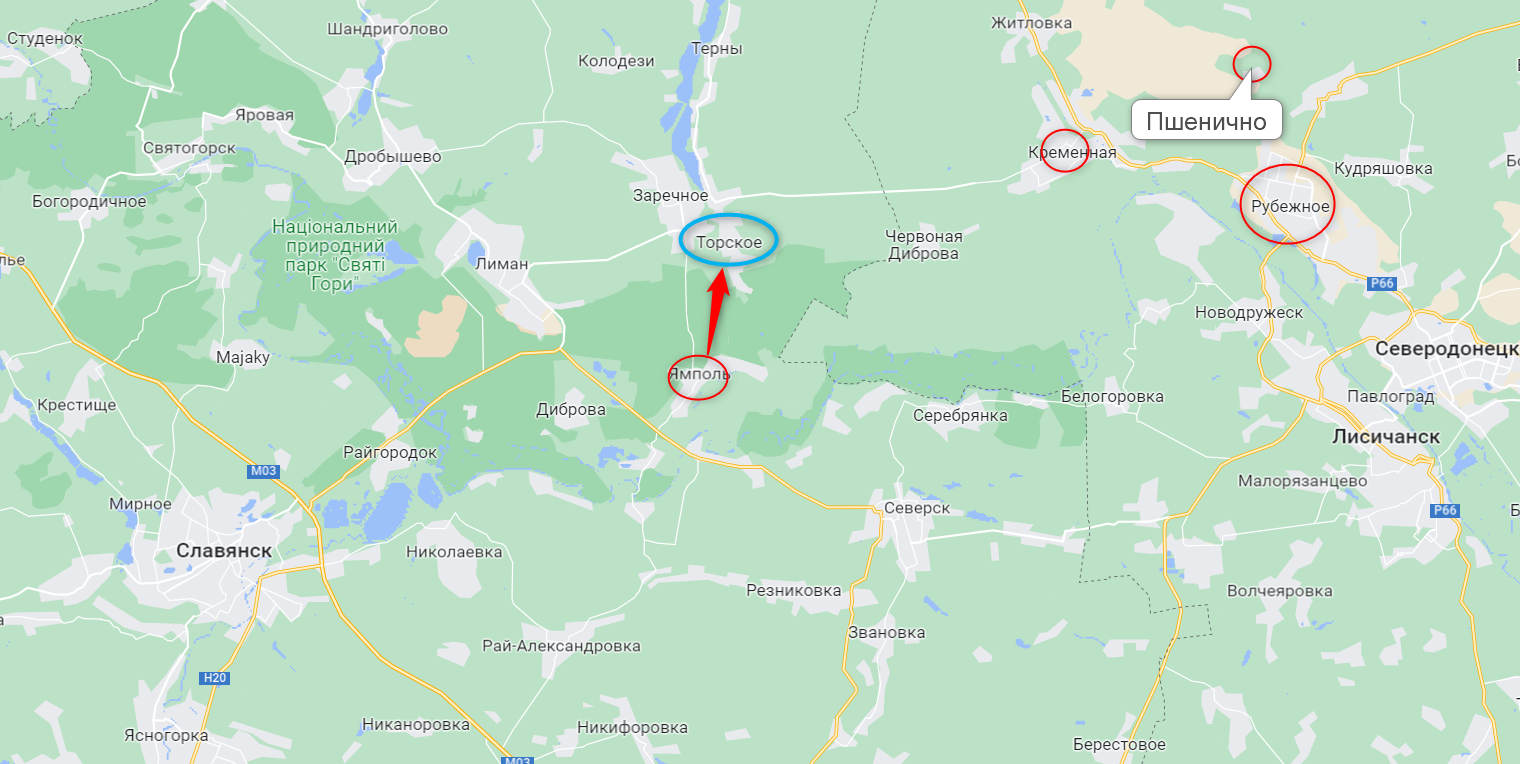 На севере Луганской области противник закрепился в ряде населенных пунктов (красный круг на карте), также атаковал село Торское, но, по данным Генштаба, отступил оттуда. В целом виден тренд на продвижение в сторону Славянска уже с востока (изюмская группировка прорывается к нему с севера).