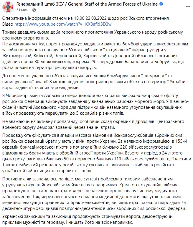 "По имеющейся информации, в 155-й отдельной бригаде морской пехоты с начала войны около 220 военнослужащих отказались участвовать в вооруженной агрессии против Украины. Всего, в период с 24 февраля этого года, погибли около 50 и ранены около 110 военнослужащих этой части. Также большой резонанс в российском обществе вызывает гибель в российско-украинской войне высших и старших офицеров", - добавляют в ведомстве.