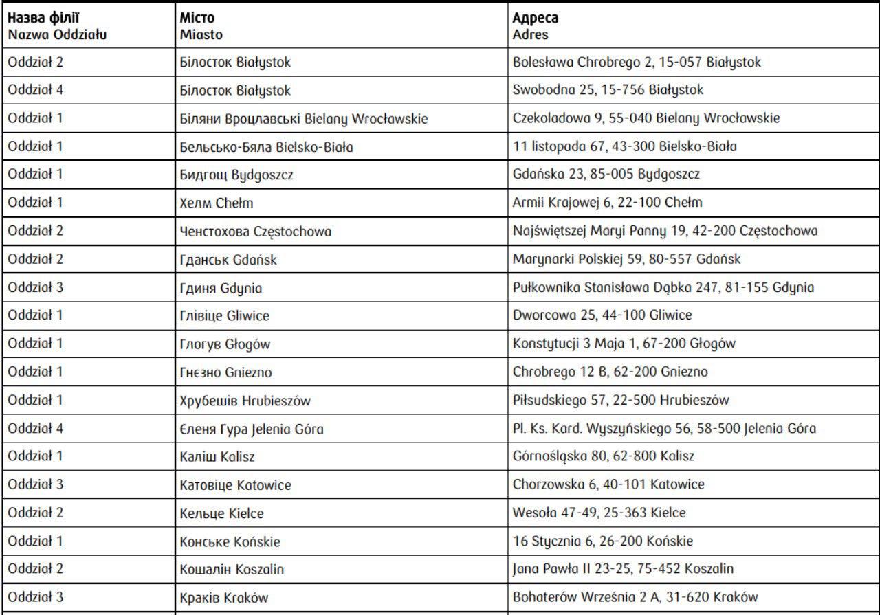 Вот список отделений банка, меняющего гривну на злотые.