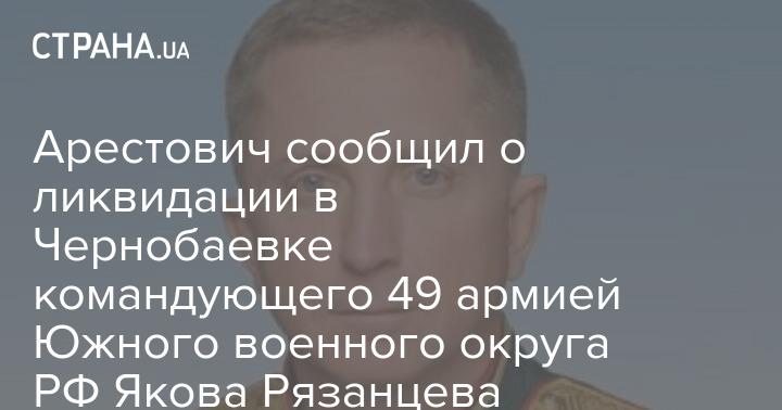 "Наши войска, сейчас мы можем сказать наверняка, уничтожили командующего 49-й общевойсковой армией Южного военного округа Российской Федерации, генерал-лейтенанта Якова Владимировича Рязанцева. И это произошло, вы будете очень смеяться, на аэродроме Чернобаевка близ Херсона", - сказал Арестович.