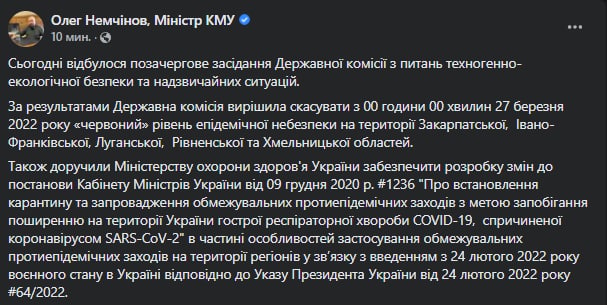 "Сегодня состоялось внеочередное заседание Государственной комиссии по техногенно-экологической безопасности и чрезвычайным ситуациям. По результатам Государственная комиссия решила отменить с 00 часов 00 минут 27 марта 2022 "красный" уровень эпидемической опасности на территории Закарпатской, Ивано-Франковской, Луганской, Ровенской и Хмельницкой областей", - указано в сообщении.