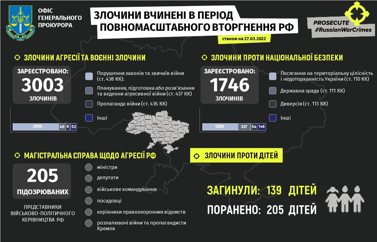 "По состоянию на утро 27 марта 2022 года 139 детей погибли и более 205 ранены из-за вооруженной агрессии Российской Федерации. Больше всего пострадало детей в Киевской – 65, Харьковской – 45, Донецкой – 53, Черниговской – 38, Николаевской – 29, Луганской – 25, Запорожской – 19, Херсонской – 21, столице – 16, Житомирской – 15 и Сумской – 14 областях", - говорится в записи.