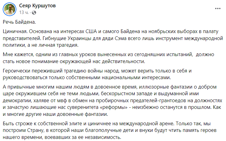 А привычные многим нашим людям в довоенное время, иллюзорные фантазии о добром царе окружившем себя не теми людьми, бескорыстном западе и выдуманной ими демократии, халяве от мвф в обмен на пробирочных предателей-грантоедов на должностях и зачастую лишающие нас суверенитета "реформы" - неизбежно останутся в прошлом. Как и многие другие наши довоенные фантазии", - считает бизнесмен Сеяр Куршутов.