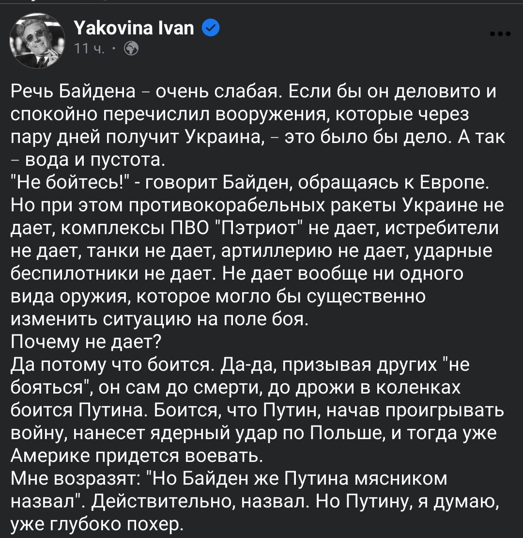 Журналист Иван Яковина назвал речь Байдена "очень слабой".