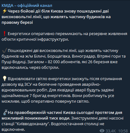 Как заявили в КГГА, из-за боевых действий возле Киева повреждены две высоковольтные линии, питающие часть домов на правом берегу Днепра.