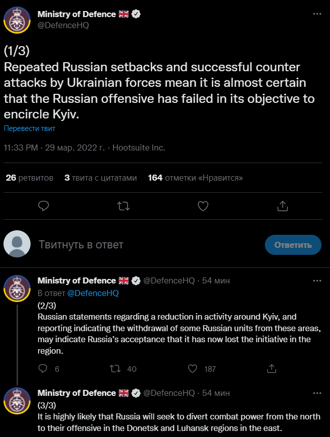 "Неоднократные неудачи русских и успешные контратаки украинских войск почти наверняка означают, что российское наступление не достигло своей цели окружить Киев. Заявления России о снижении активности вокруг Киева и сообщения о выводе некоторых российских подразделений из этих районов могут свидетельствовать о признании Россией того факта, что теперь она потеряла инициативу в регионе. Весьма вероятно, что Россия будет стремиться отвлечь боевые силы с севера для своего наступления в Донецкой и Луганской областях на востоке", - считают в Минобороны Британии.