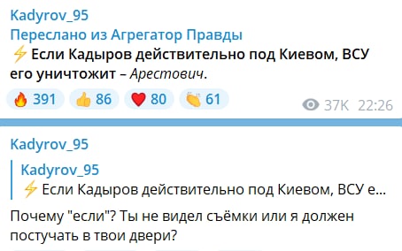 В тот же день Кадыров ответил на предположение советника главы ОП Арестовича, что если глава Чечни под Киевом, то его уничтожат.