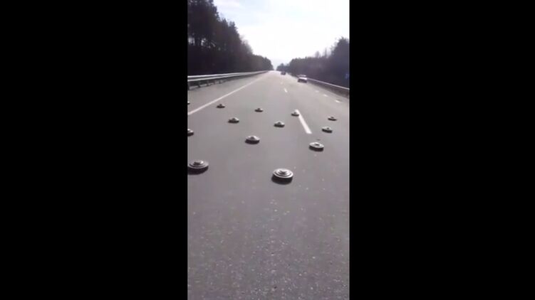 Под Киевом машинам ради проезда приходится маневрировать между десятками мин. Видео