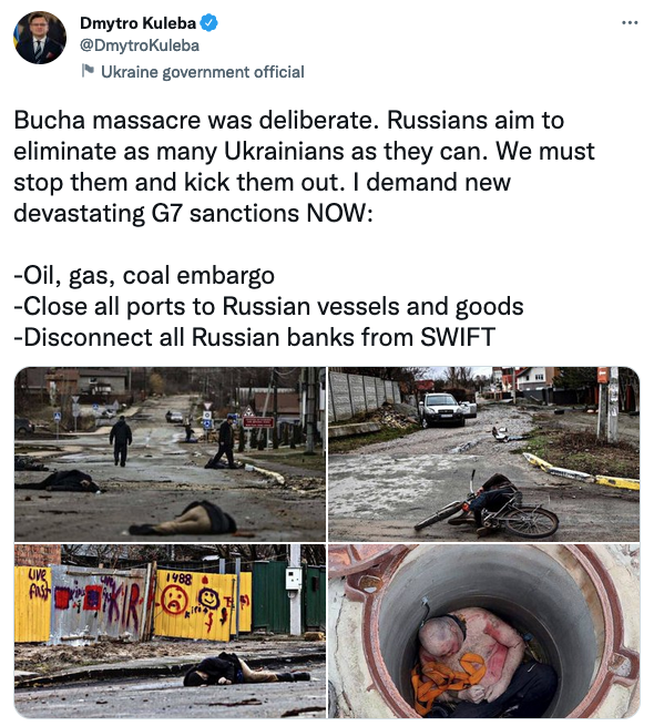 "Резня в Буче была преднамеренной. Русские стремятся уничтожить как можно больше украинцев. Мы должны остановить их и выгнать. Я требую новых разрушительных санкций G7 прямо сейчас", - сказал он.