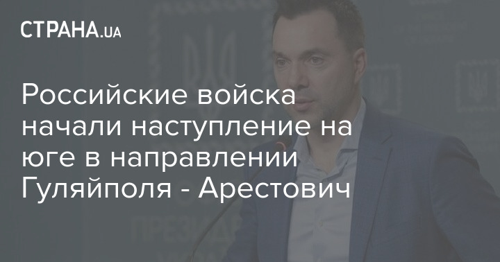 "Наконец-то южный фланг российской группировки пришел в движение, двинулся. Мы ждали этого дня… Наконец-то поехали туда, условно говоря, в сторону Гуляйполя Запорожской области. Двигаются они очень аккуратненько, по ротной тактической группе проползая от населенного пункта ... Пока в первые два - три (населенные пункта) зашли, но наконец-то обозначили какое-то движение," - сообщил Арестович.