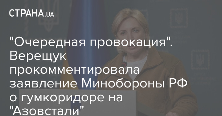Вице-премьер Украины Ирина Верещук прокомментировала "Стране" заявление Минобороны РФ об открытии сегодня гуманитарного коридора для мирного населения на "Азовстали".