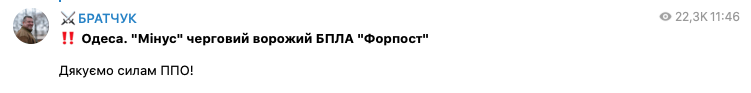 "Минус" очередной вражеский БПЛА "Форпост". Спасибо силам ПВО!"- написал он.