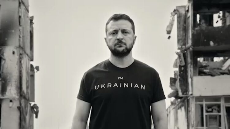 Оно выдержано в чёрно-белых тонах. И, хотя формально памятная дата касается окончания Второй мировой, за спиной у Зеленского - хроника нынешней войны в Украине с короткими вставками событий 77-летней давности.