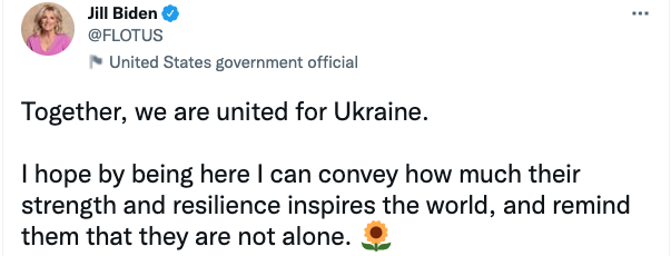 "Вместе мы едины для Украины. Надеюсь, находясь здесь, я смогу передать миру, насколько их сила и стойкость вдохновляют мир, и напомнить им, что они не одиноки", - написала супруга Байдена.