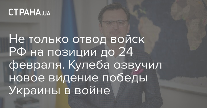 Глава МИД Украины Дмитрий Кулеба заявил, что победой в войне с РФ будет считаться не отвод российских войск на позиции до 24 февраля, как обсуждалось ранее, а полное освобождение всех украинских территорий.