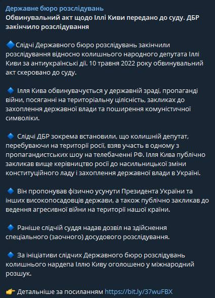 Следователи ГБР установили, что бывший депутат, находясь на территории России, принял участие в одном из пропагандистских шоу на телевидении РФ. Илья Кива публично призвал высшее руководство России к насильственному изменению конституционного строя и захвату государственной власти в Украине. Он предлагал физически устранить президента Украины и других чиновников государства, а также публично призвал к ведению агрессивной войны на территории нашей страны.