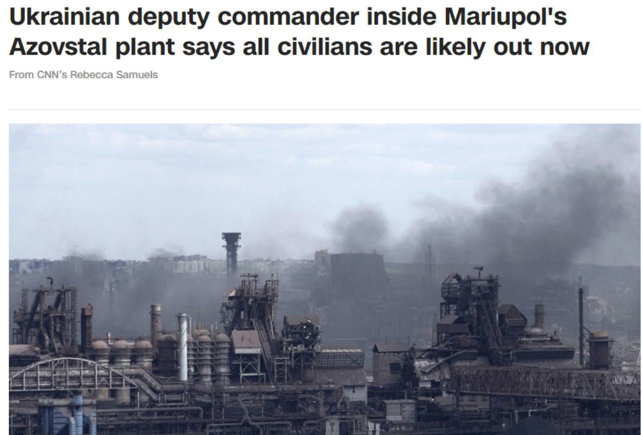 "Если вы говорите о самом заводе "Азовсталь", то гражданские лица, о которых мы знали, гражданские лица, которые были с нами, гражданские лица, о которых мы заботились, их с нами нет. Им удалось покинуть завод. Но я не могу сказать вам наверняка, может быть, есть кто-то еще дальше на территории, потому что ни одна международная организация в какой-либо момент не приезжала и не имела доступа, чтобы приехать и оценить ситуацию", — сказал он CNN.