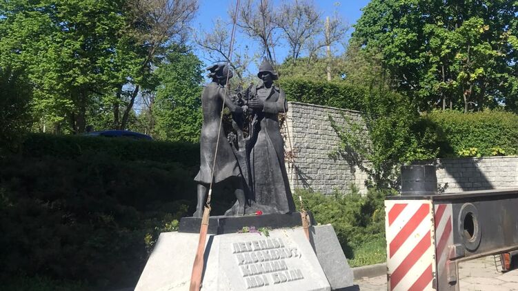 В Днепре на Соборной площади вчера демонтировали памятник комсомольцам - парню и девушке, которые сажают дерево. Надпись на монументе гласила: "Легенды расскажут, какими мы были".