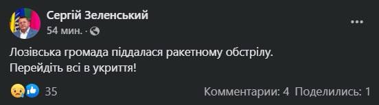 Напомним, город обстреливали ракетами неоднократно. 11 мая вечером мэр Лозовой также сообщал, что Лозовскую громаду обстреляли ракетами. В результате погиб один человек.