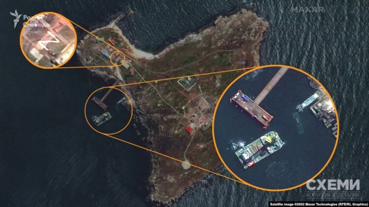 "То есть, судя по всему, остров находится в руках россиян (для того они и нанесли букву Z)", - комментирует Telegram-канал "Политика Страны".