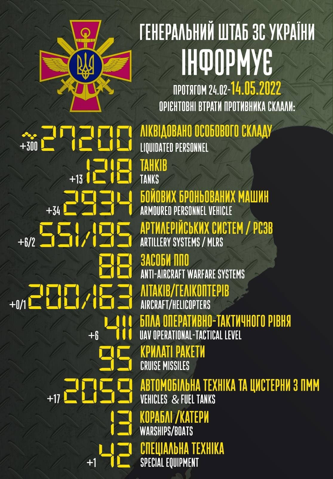 Генштаб Вооруженных сил Украины опубликовал данные по общим боевым потерям противника с начала его нападения на Украину - в период с 24 февраля по 14 мая.