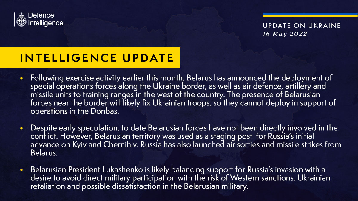 08:47 Развертывание сил спецопераций Беларуси вдоль границы с Украиной, о котором Минск объявил 10 мая, вероятно, задержит украинские войска в этом районе. Поэтому их не смогут перебросить для поддержки операций на Донбассе, сообщает разведка Британии.
