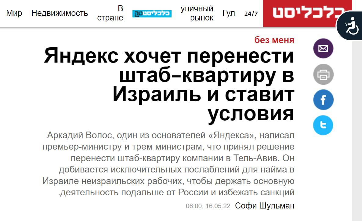 10:45 Один из основателей "Яндекса" Аркадий Волож написал премьер-министру Израиля и трем министрам, что принял решение перенести штаб-квартиру компании в Тель-Авив.