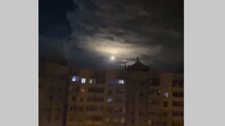 В небе над ночным Белгородом в сторону Украины летят огненные шары. Видео