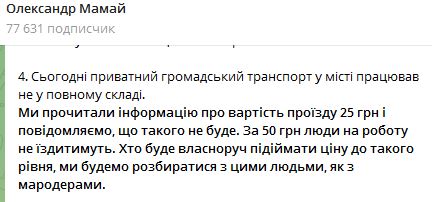 "Мы прочли информацию о стоимости проезда 25 грн и сообщаем, что такого не будет. За 50 грн люди на работу не будут ездить. Кто будет лично поднимать цену до такого уровня, мы будем разбираться с этими людьми, как с мародерами", – сообщил Мамай в своем телеграм-канале перед выходными.