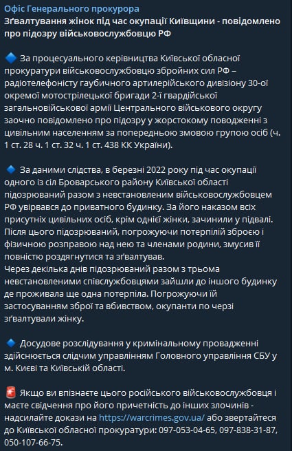 В Украине заочно сообщили о подозрении военному РФ, который насиловал женщин под Броварами