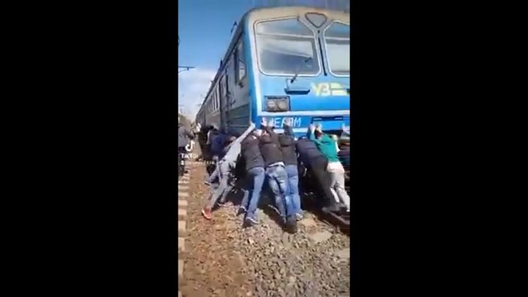 Под Киевом пассажиры вручную отбуксировали электричку из восьми вагонов. Видео